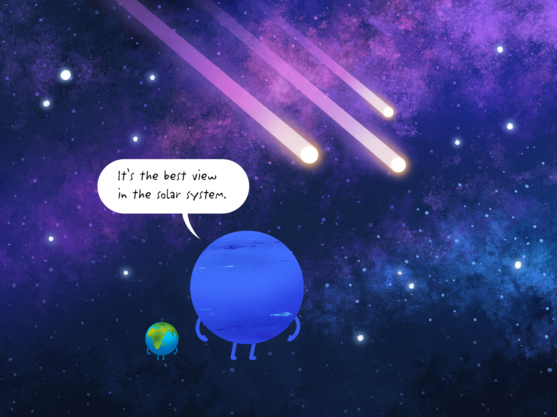 Visual development and final images for a children's book I wrote and illustrated called Earth Yay! Animation by the team at Vooks.com. Earth Yay! was the most viewed title in the Vooks library in 2021 and 2022. While visiting the other planets, Earth learns its friends are all good at something. But what’s special about Earth? With playful themes of friendship, self-expression, and celebrating differences, Earth Yay! is a loving ode to the planet we all call home.