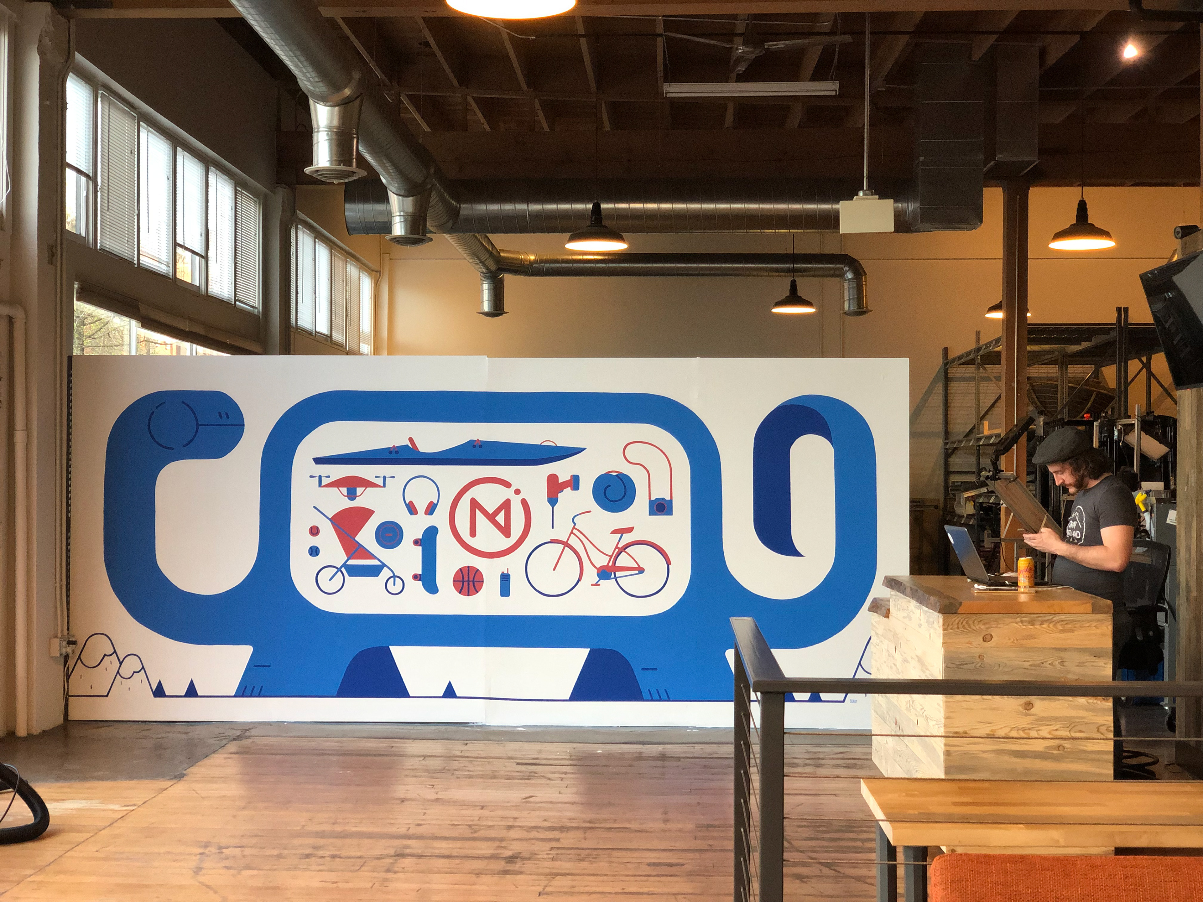 Design and execution of a dinosaur mural for Omni's Portland office. Omni stores your bikes, gear and other products and then rents them out so you can earn money on items that would normally sit in your garage. Direction by Christopher Ludke. Mural co-painted with Megan Marie Myers.